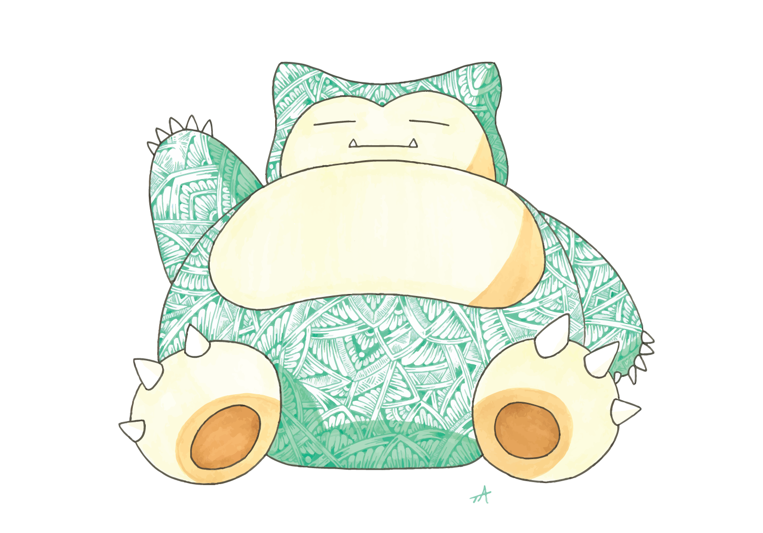 This hand-drawn artwork features a relaxed Snorlax decorated with calming, tribal-style patterns in soft green tones.